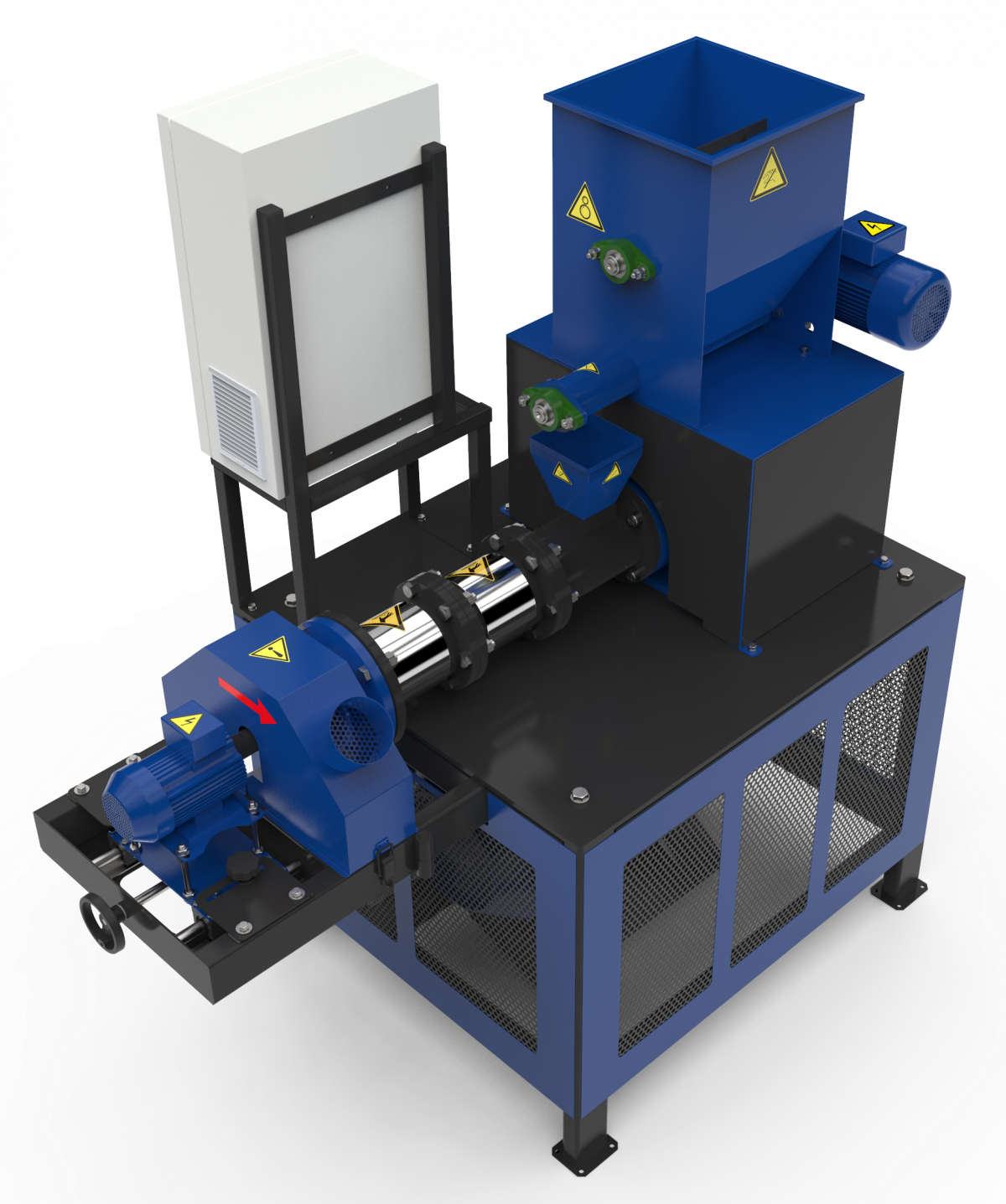 Oferim, de asemenea, completari frumoase la extruderul EGK-60: echipamentul este echipat cu un separator magnetic, un buncar cu alimentare cu surub de materii prime si o carcasa metalica puternica.