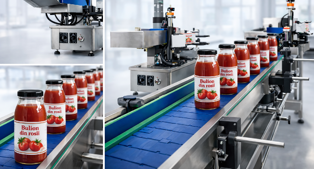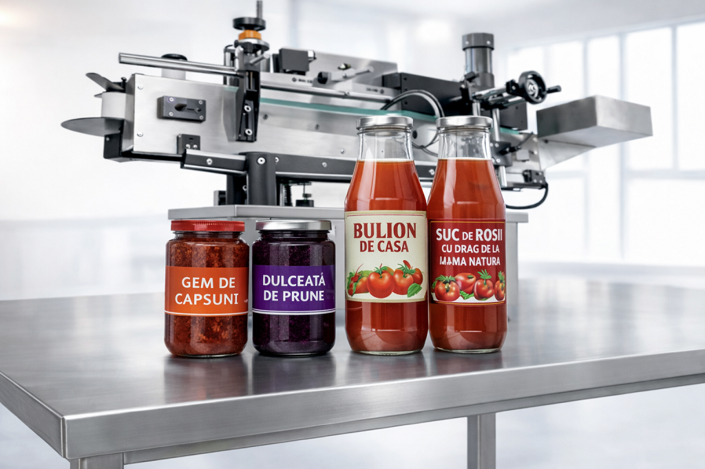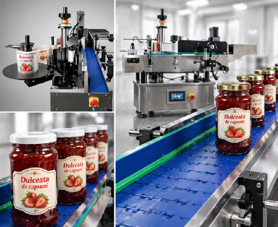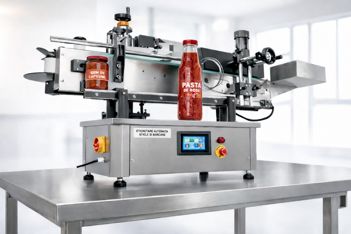 Masina automata etichetare sticle si borcane – compacta, profesionala si eficienta