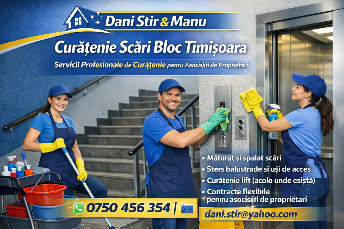 Cauti o firma serioasa si eficienta pentru curatenie in scari de bloc in Timisoara? Echipa Dani Stir & Manu ofera servicii complete de curatenie pentru asociatii de proprietari, blocuri rezidentiale si imobile din Timisoara si imprejurimi.