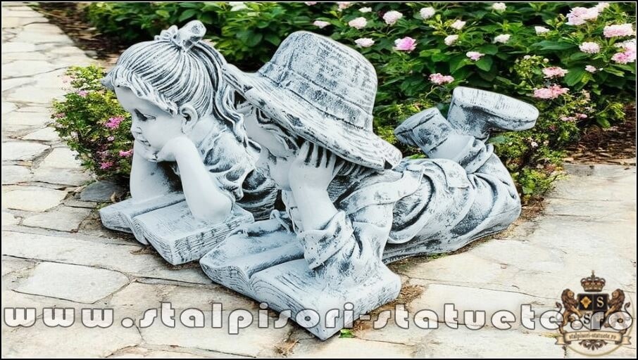 Set statuete doi copii scolari, gri patinat, model S15.