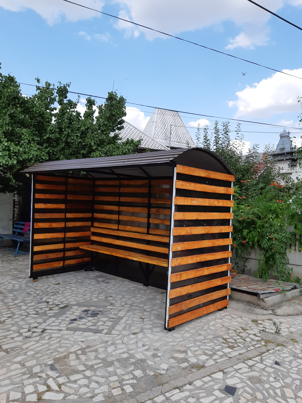 Statie de refugiu pentru calatori structura metalica cu poli carbonat de 3 mm. Grosime cu riglete de blana de brad.
