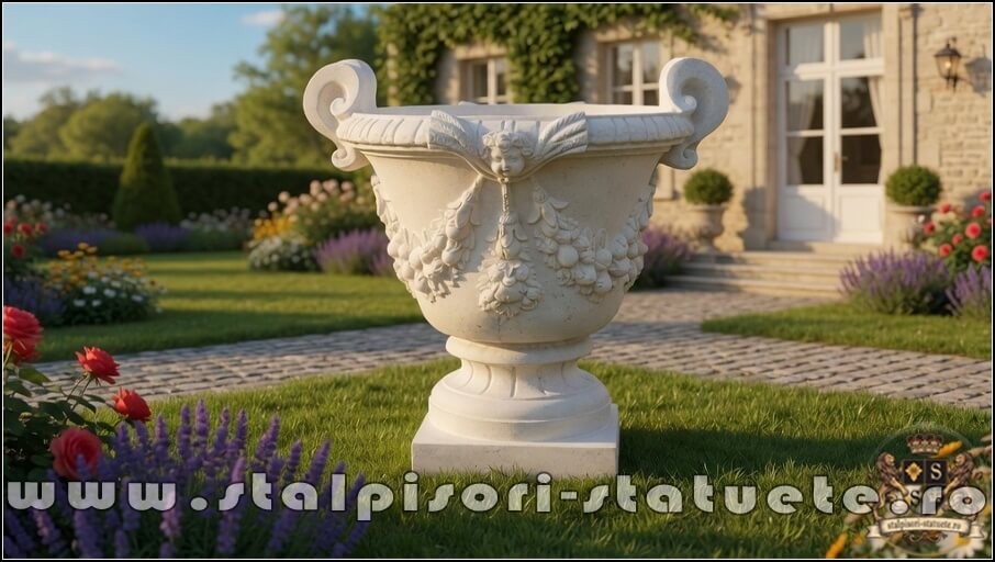 Vaza mare cu picior, alb marmorat, model V2.