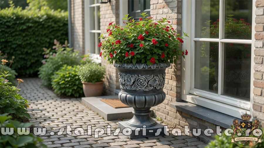 Vaza ornament cu picior, gri patinat, model V7.